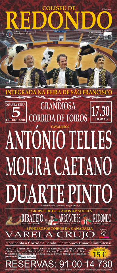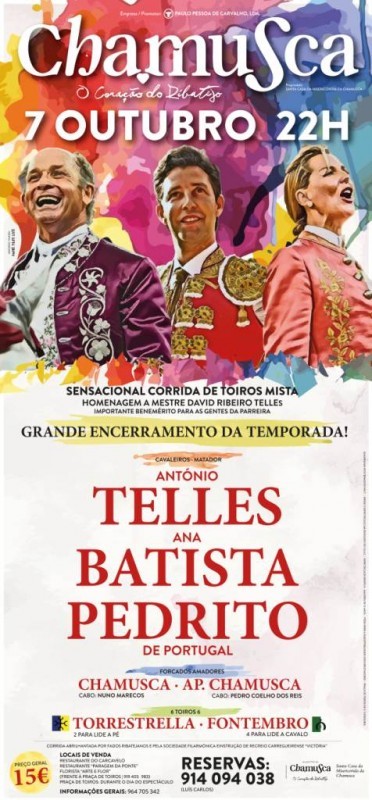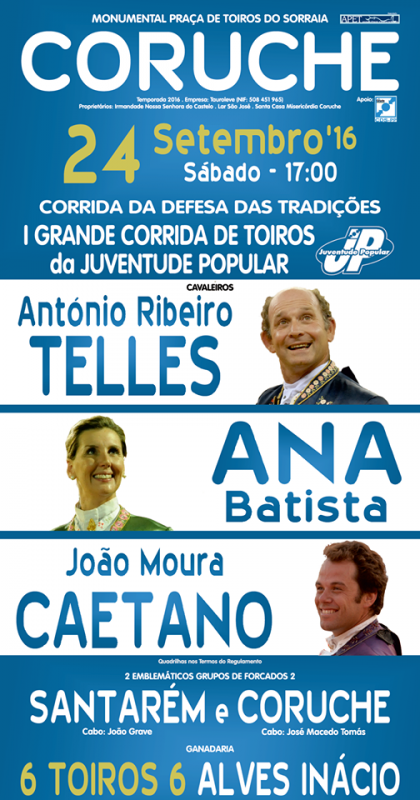A partir das 17:00, três conceitos distintos de toureio rivalizam entre si numa tarde de compromisso. António Ribeiro Telles, Ana Batista e João Moura Caetano lidam um imponente curro de toiros da novel ganadaria de Alves Inácio, numa tarde em que as pegas estarão a cargo dos amadores de Santarém e amadores de Coruche, capitaneados por João Grave e José Macedo Tomás respetivamente.