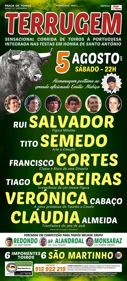 A corrida do Emigrante e, simultaneamente corrida concurso de pegas, teve na pega de caras efectuada à segunda tentativa por Diogo Amaro (ABV Alcochete) o momento álgido da corrida, com o público de pé a aplaudir no final da pega e nas voltas à arena do valentíssimo forcado. Uma pega dura e difícil, com o forcado muito bem a citar, a provocar a investida, a recuar até se fechar com raça e galhardia, a suportar os derrotes e, se na primeira tentativa as falharam junto a tábuas, na segunda foi o toiro a fugir ao grupo e o forcado bem fechado na cara a aguentar até ao limite e o grupo a consumar com valor. Saíu em ombros no final, depois de duas voltas e meia à arena já que na segunda houve protestos por o cavaleiro ir junto…