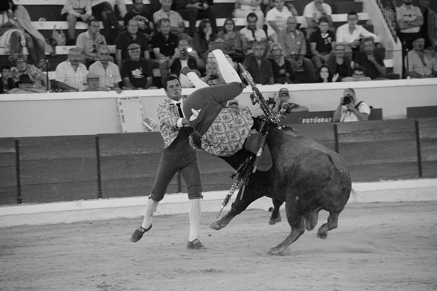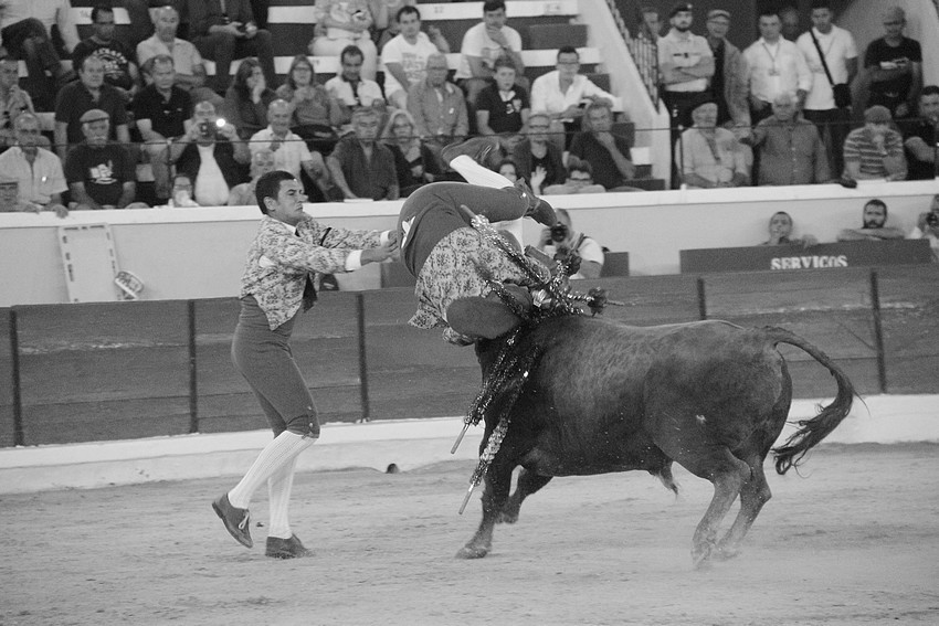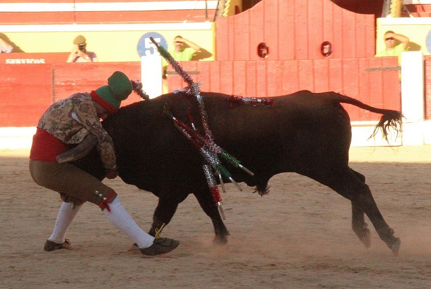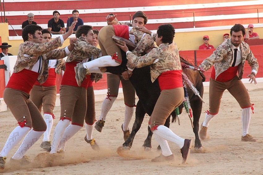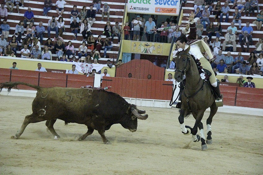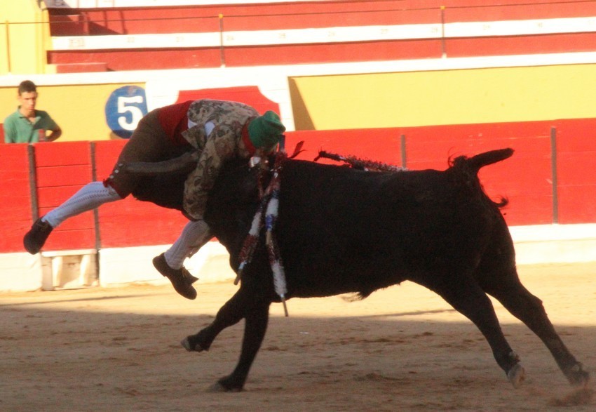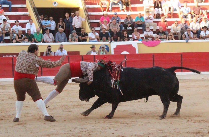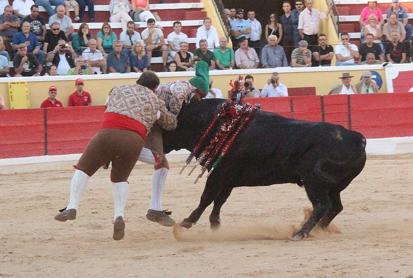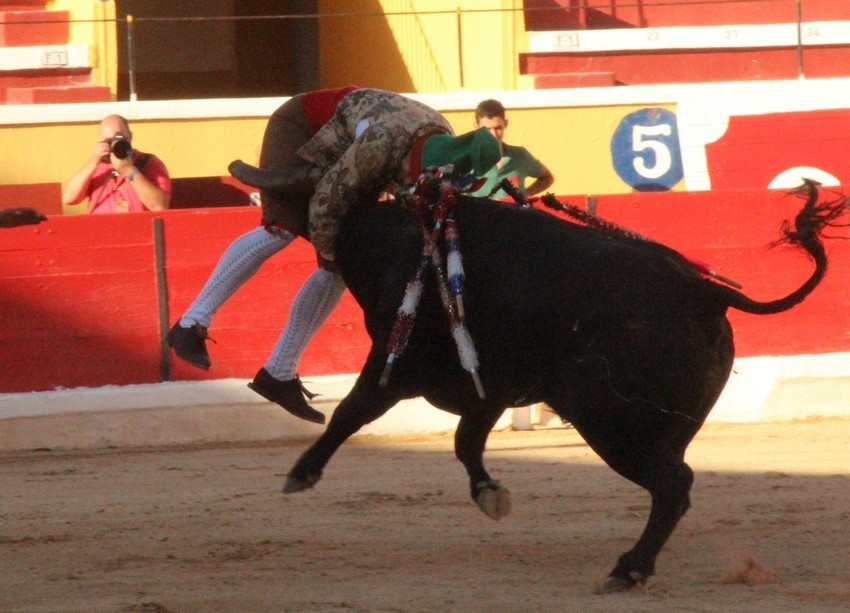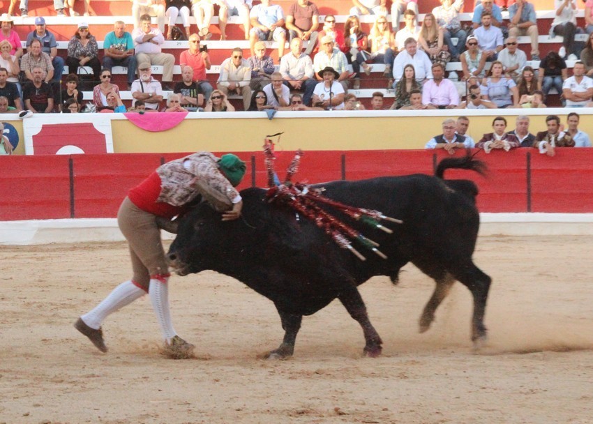 Comecemos pelos Forcados do Aposento da Moita que, tradicionalmente se encerram a solo na corrida de 5ª feira e que, este ano apostou em pegar os seis “Teixeiras”. Os toiros saíram com pata para os forcados, foram duros nas investidas mas, e há sempre um mas, os forcados da cara nem sempre souberam entender os momentos ideais para as reuniões e os ajudas nem sempre cumpriram a sua função. A verdade é que, com tantas dificuldades, conseguiram consumar as sete pegas de caras, seis delas a sesgo e ao fim de muitas tentativas e uma à segunda (a do novilho), por intermédio de José Henriques (à 4ª na sua despedida das arenas), João Vasco Ventura (à 3ª), Martim Afonso à primeira (a dobrar Salvador Pinto Coelho que se lesionou ao fim de 4 tentativas), João Gomes (à 2ª), Ruben Serafim (à 4ª), José Maria Bettencourt (à 5ª) e Luís Fera (à 1ª a emendar Miguel Fernandes, lesionado na 2ª).