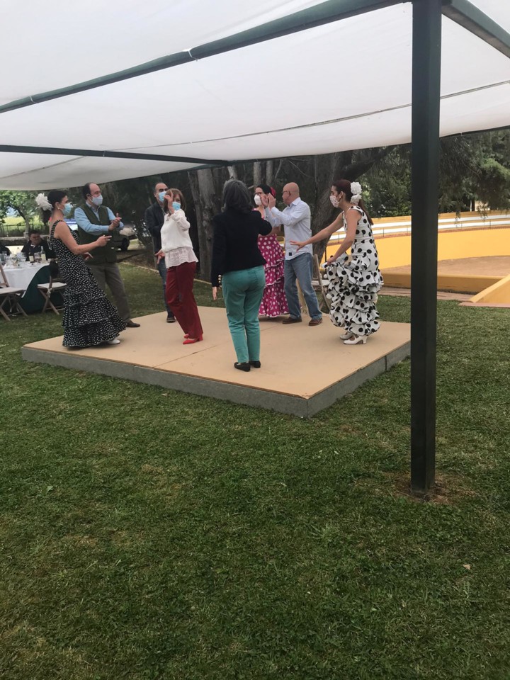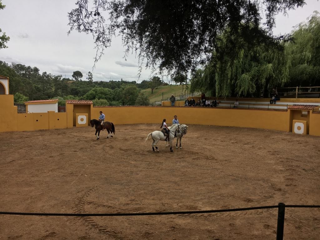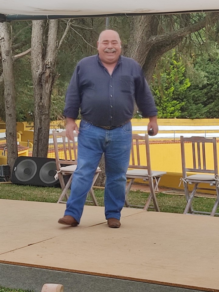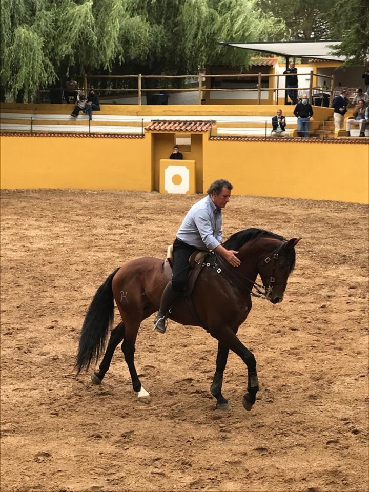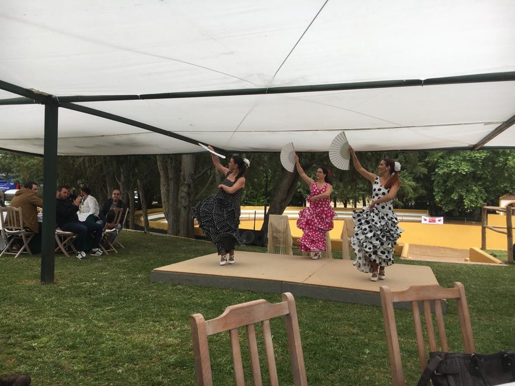A capela, o picadeiro, a sala de trajes e arreios, tudo bem explicado, completaram a primeira parte do programa, a que se seguiu o almoço. Servido ao ar livre, com o ‘tendadero’ por fundo, o repasto teve como generosa sobremesa a surpreendente declamação de um ribatejano de ‘coração’, o Raul Caldeira, que brindou a concorrência com emotiva ode ao Tejo, Ribatejo, e suas gentes. Seguiu-se-lhe um também muito apreciado e aplaudido bailado flamengo por um trio de ‘sevilhanas’, actuação que culminou em comunhão de palco com muitos dos convidados.