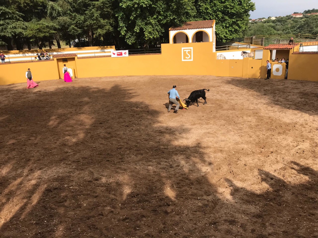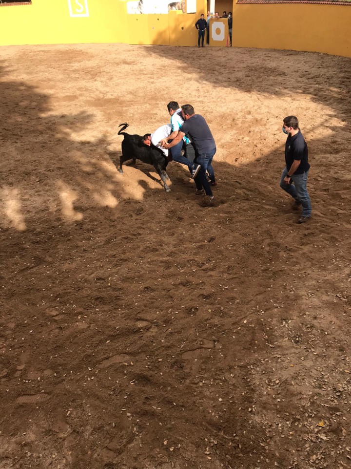 Se a visita guiada, o almoço, os encontros e reencontros já tinham criado ambiente, a demonstração, actuação, da “arte de bem cavalgar em toda a sela”, com direito a explicação através de instalação sonora do anfitrião, Rui Salvador, que convidou a madrinha do grupo, Soraia Costa e um mestre de equitação em serviço na casa, foi o top do concebível. Os três novilhos que depois foram lidados por Rui Salvador e Soraia Costa, e pegados, entre outros por um jovem padre incluído no grupo de aficionados ‘Garraiadas do Norte’, a maioria da área de Famalicão, serviram também para experiências no trasteio de capote, em temerárias lides, ao voluntarioso diestro Joaquim Mesquita.